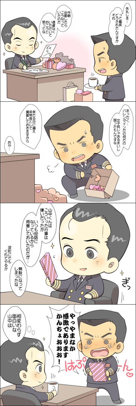 遅ればせながらバレンタインねたー陸仕事はオフィスラブ。とりあえず艦長はぷにく丸めるのすら至難の業である。そんな感じで沈艦DVD届きました!艦長が物っ凄い渋いカリスマ声で不覚にもはぷーんとなりましたそりゃACN世界アンケートも75パー超えるわ私も艦長の言葉をもっと聞きたいわ…そして山中の声は非常におじいちゃんだった。ていうか艦長のご高説への水向けポジションだからか頭の回転の鈍い人って感じになってて若干キュンとした。関係ないけどライアン大佐とモーツァルト聴いてるシーンで艦長って大仏顔だよね…と思った大仏っていうかピンポイントで中宮寺の弥勒菩薩半跏思惟像っぽい。神々しさがアルカイックである。山中は個人的には初期のモブ顔も野武士っぽくて好きなんだけどやっぱあの板前カットと下マツゲがね…いじめたくなるストイックさを醸し出してるよね…