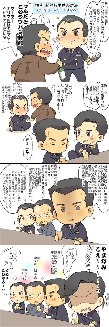 山中は艦長の送迎係なのでオレンジジュースです。ていうか艦長への陶酔という意味では常時ハイドランカー。どうでもいいけど以前親睦会的なアレで制服組の飲み会に同席させてもらったことがあるんですがとにかく酒タバコ酒タバコ酒タバコ…って印象で若干引いた記憶があります。江田島行ってまでタバコ買いに走らされた微妙な思い出…そんな感じで個人的には艦長っていうかやまなみ組は酒もタバコもやらない的な…むしろワインと葉巻でおハイソな仕上がりとか激しく希望なんですが現実はまあ何かにつけドンチャンやってたんだろうなあという妄想です。そして艦長は何となくザルなイメージ…何か平然とぱかぱかボトル開けてそうあーでもー!下戸なら下戸でそれもまた萌えっていうか下戸じゃないと山中が艦長を介抱する鉄板展開が回ってこないじゃんダメじゃん!つーか艦長色白だしさ…酔ったら多分首筋まで赤くなるよね…ポンパ気味のオールバックも気持ちお乱れになるのよね…そんで貸された肩に無防備に体重をあずけネクタイ緩めながら「世話をかけるな…」とかかすかに微笑む艦長の!上気した声!気だるげな瞳!やべーよ独立ののろし上がっちゃうよ山中じゃなくても決起するよ普段の艦長が鉄壁だからこそ…今夜あんたを酔わせたい。ていうか艦長40代前半山中30代後半って感じだろうけどあれです山中と速水も同期だったりしたら色々と夢が広がりんぐです…深町海江田が4年生の頃1年生とかでさー防衛大幹候校と学生時代から色んな意味で噂のたえない二人にそれぞれ憧れてたらいいよねみたいな。そんな感じで「山中くんで遊ぼう」は不定期シリーズになります何かね…いっつも艦長の斜め後ろあたりであたふたしてる山中のことを想うとこう…ウフフってなるんだ…ていうか艦長も深海の魔王な白艦長時と黙示録に記されしメシアな黒艦長時とでたいがい酷い二重人格だけど山中もまた艦長とそれ以外とでは結構態度変わるよねと思う。たまに艦長より冷たい目してる時とかあるしたまらん萌えです。